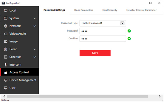 Po podłączeniu zamka szyfrowego DS-KD-KP G73668 do modułowej stacji bramowej DS-KD8003-IME1 G73652 lub DS-KD8003-IME2 G73644 możliwe jest sterowanie pierwszym przekaźnikiem w stacji bramowej z wykorzystaniem zaprogramowanych wcześniej kodów. Za pomocą aplikacji iVMS-4200 można ustawić bezpośrednio w stacji bramowej do 16 kodów publicznych składających się z 4-6 cyfr oraz w każdym monitorze 1 prywatny kod składający się z 6 cyfr. Aby otworzyć furtkę za pomocą zaprogramowanego kodu publicznego, na klawiaturze należy wpisać sekwencję: # ustalony kod #. W przypadku kodu prywatnego nadanego w stacji wewnętrznej, otwarcie następuje po wpisaniu sekwencji: # numer mieszkania, ustalony kod #. Po dodaniu urządzeń do iVMS-4200, kody ustala się w poniższych lokalizacjach:- stacja bramowa: Ustaw.zdalne -> Access Control -> Password Settings