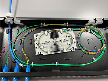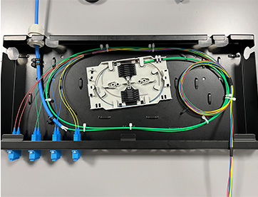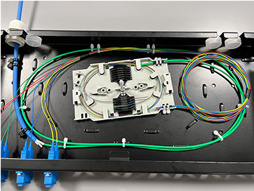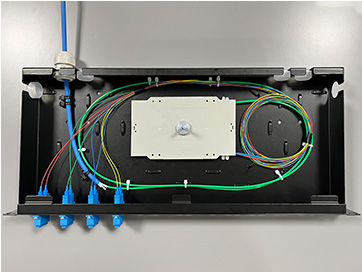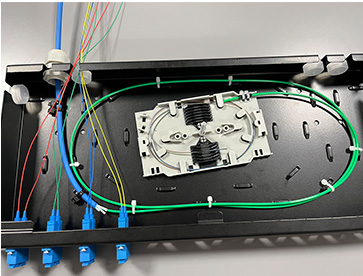 Na poniższych zdjęciach przedstawiono kolejne etapy realizacji zakończenia 8-włóknowego kabla uniwersalnego DRAKA L76008 w przełącznicy RACK 1U L51454. Wykorzystane zostały adaptery SC duplex L42211 oraz zestawy kolorowych pigtaili Ultimode PG-171A-1 SC/UPC L34171A.
