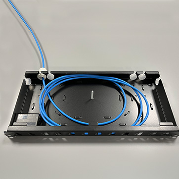 Wprowadzenie kabla do przełącznicy. Należy pamiętać o odpowiednim zapasie umożliwiającym wygodne spawanie oraz ewentualne prace instalacyjne w przyszłości. Zapas tuby przed wejściem na kasetę spawów pozwala na odzyskanie włókien w przypadku ich urwania/złamania w kasecie spawów. Umożliwia również pracę z kasetą poza przełącznicą. Wprowadzając włókna do kasety należy pamiętać o zapasie i dopasowaniu długości do ostatecznej pozycji osłonki spawu w holderze.