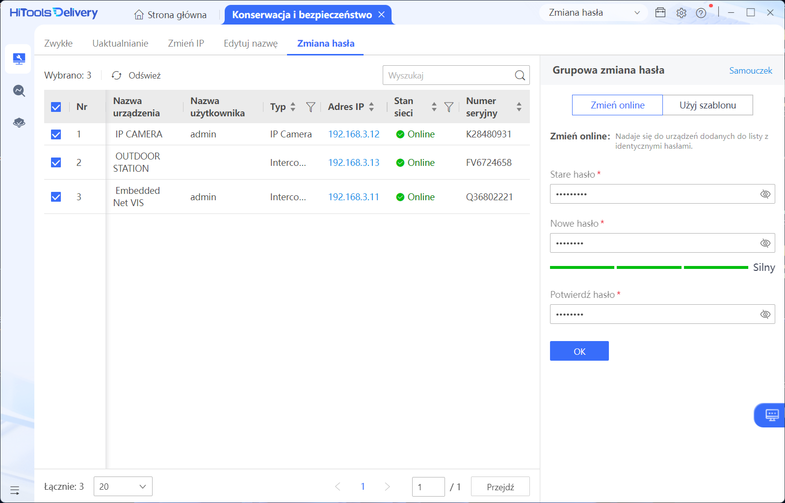 HiTools Delivery to narzędzie, które oprócz wielu zaawansowanych funkcji jakie oferuje, pozwala na grupową zmianę hasła w wielu urządzeniach Hikvision. Jest to bardzo wygodna opcja, która szczególnie przydaje się przy modernizacji dużych instalacji, w których urządzenia mają różne hasła a istnieje potrzeba ich ujednolicenia. Aby grupowo zmienić hasła w urządzenia, należy po zainstalowaniu, uruchomieniu i dodaniu wszystkich urządzeń do programu, przejść do zakładki Konserwacja → Zmiana hasła. W następnym kroku należy zaznaczyć wszystkie urządzenia, które posiadają to samo hasło, w zakładce po prawej stronie wpisać stare hasło administratora do urządzeń, nowe hasło i ponownie je potwierdzić. Jeśli urządzenia mają zupełnie różne hasła, procedurę zmiany należy przeprowadzać w odpowiednich grupach.
